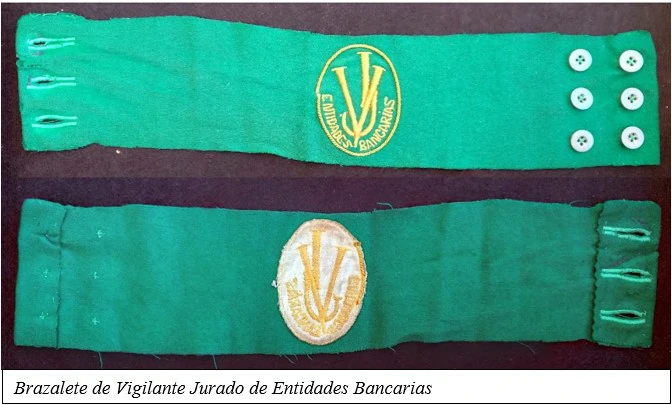 El escudo emblema que utilizan, y determinado también por esta misma Orden será un brazalete de color verde, en el que irá bordado un emblema, cuyo diseño se acompaña, compuesto del enlace de las letras V. y J. con la mención “entidades bancarias” en amarillo